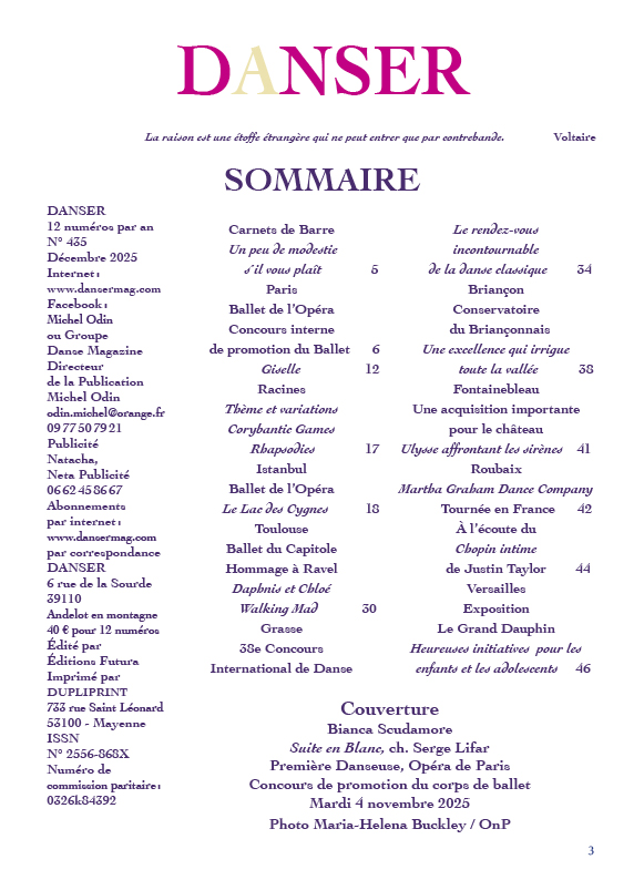 Carnets de Barre Un peu de modestie s’il vous plaît 5 Paris Ballet de l’Opéra Concours interne de promotion du Ballet 6 Giselle 12 Racines Thème et variations Corybantic Games Rhapsodies 17 Istanbul Ballet de l’Opéra Le Lac des Cygnes 18 Toulouse Ballet du Capitole Hommage à Ravel Daphnis et Chloé Walking Mad 30 Grasse 38e Concours International de Danse Le rendez-vous incontournable de la danse classique 34 Briançon Conservatoire du Briançonnais Une excellence qui irrigue toute la vallée 38 Fontainebleau Une acquisition importante pour le château Ulysse affrontant les sirènes 41 Roubaix Martha Graham Dance Company Tournée en France 42 À l’écoute du Chopin intime de Justin Taylor 44 Versailles Exposition Le Grand Dauphin Heureuses initiatives pour les enfants et les adolescents 46 |